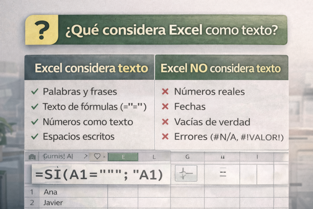 Antes de aplicar cualquier fórmula, es imprescindible entender qué considera Excel como texto, ya que de ello depende que el conteo sea correcto.